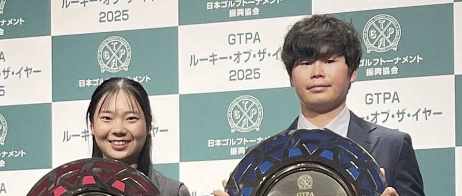 日本ゴルフトーナメント振興協会(GTPA)の表彰式が23日、都内で行われ、男子は下家秀琉(しもけ・すぐる、エレコム)、女子は菅楓華(ニトリ)と荒木優奈(Sky)がルーキー・オブ・ザ・イヤー(新人賞)を受賞した。