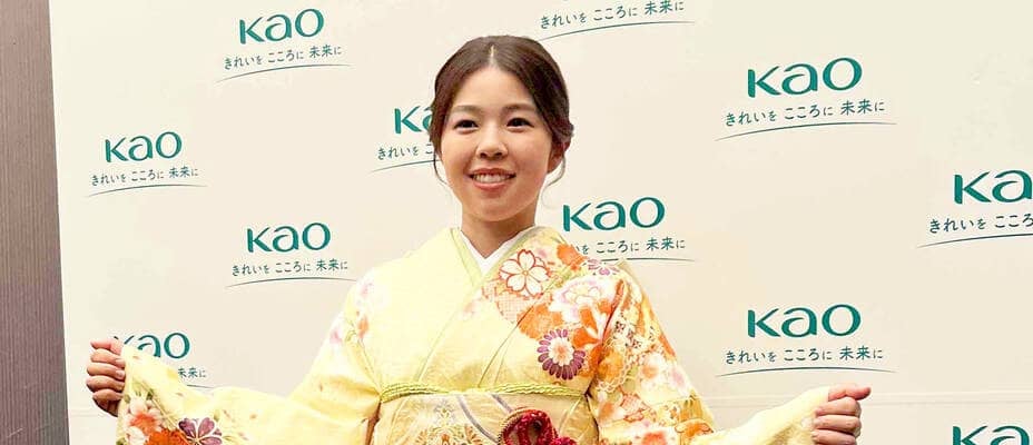 黄色い花柄の振り袖で登場し、「普段は着ないので、違和感がありますね」とニッコリ。祝賀会冒頭のあいさつでは「自分でもまだ信じられない気持ちです。今回の優勝はゴールではなくスタート。私は自分の武器であるショット力を生かして、世界NO1になることを目標に向かって、来年も海外ツアーに挑戦し続け、さらに強くなれるように努力していきたい」と堂々とスピーチした。