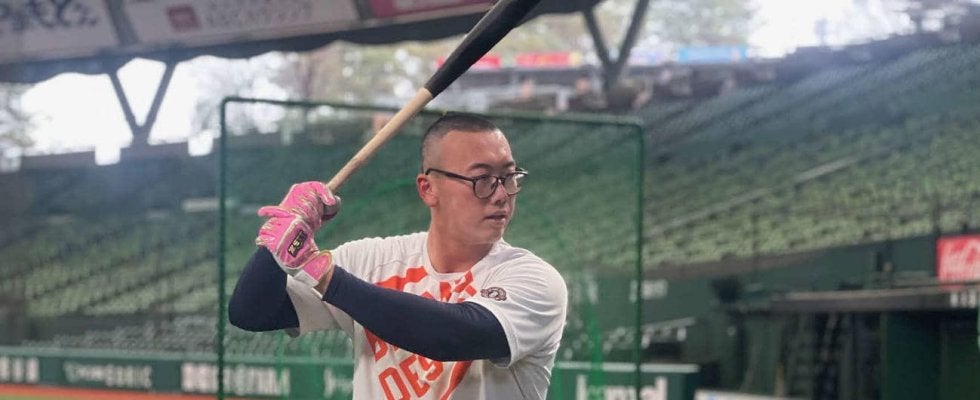 置きティーをしてから「確認のために10球だけ打ちます」とマシンに向き合い、結局は20球近く。普段はコンタクトレンズ派だが、この日は眼鏡姿で豪快にスイングする。