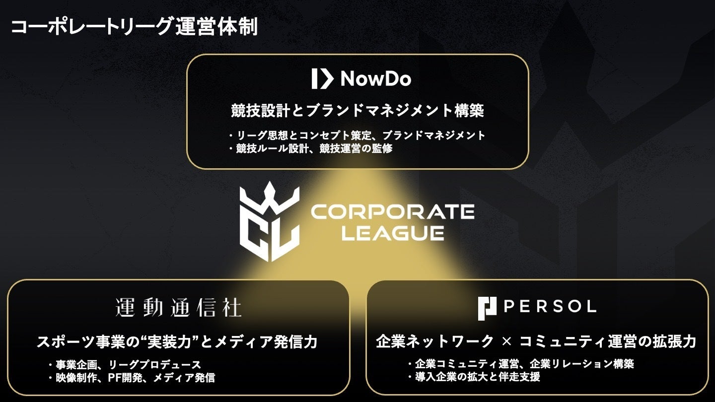 CORPORATE LEAGUEは、Now Do、運動通信社、パーソルイノベーションの3社が、それぞれの事業基盤とノウハウを結集し、共同で運営を推進します。