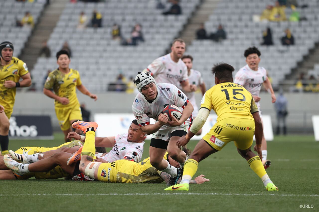 入団2年目の三木晧正。京都産業大学時代からの異名は『タックルの鬼』で、身長174cm体重95kgとフランカーとしては決して恵まれた体格ではないものの、並外れたディフェンス力が評価を高めている。今季初出場となった前節は7番を背負い23本のタックルをすべて成功させた。