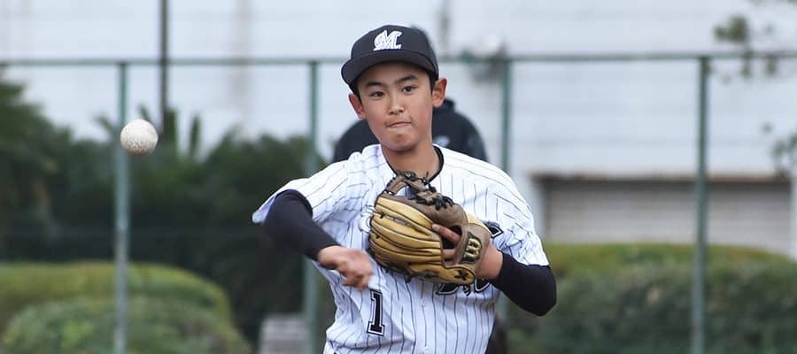 二塁を守るのは背番号「1」の糟谷悠主将(6年=海上学区スポーツ少年団)。自チームではやはり投手と捕手が主な役割だが、マリーンズジュニアでは内野の要を担う。ジュニアチームに選ばれるため、守備力を強化してセレクションに挑戦。選出されると、「このチームで、みんなをまとめたくてキャプテンになりたいと思いました」と自チームでも経験がない主将を自ら志願した。