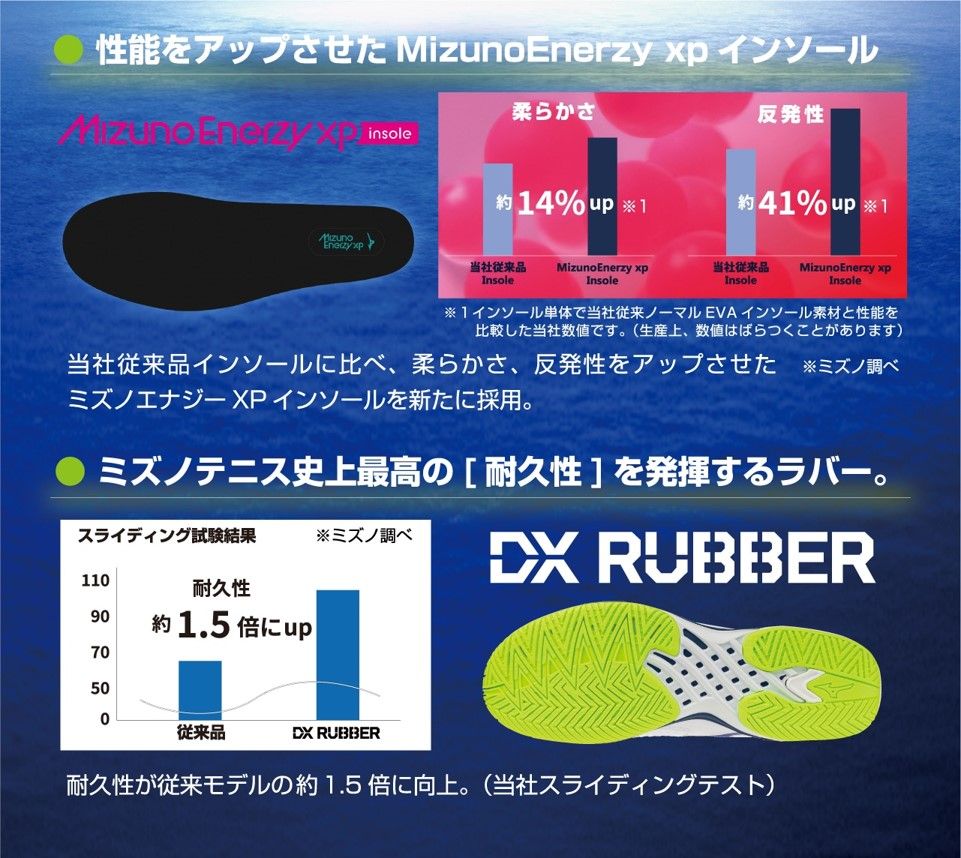 ミズノ史上最高の耐久性を発揮する「DXラバー」、更なるクッションと反発を生む「ミズノエナジーxpインソール」を本カラーより搭載。
