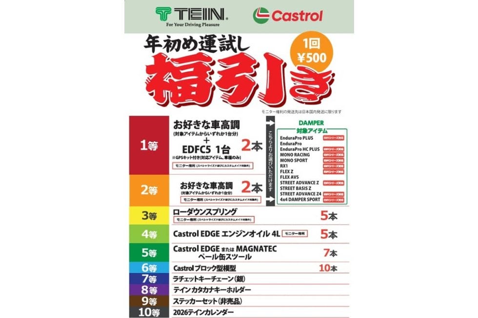 今回も一等では「車高調とEDFC5」のモニター権利が当たります。ニ等以降も注目の商品が目白押しです。詳細は福引の一覧をご確認ください。