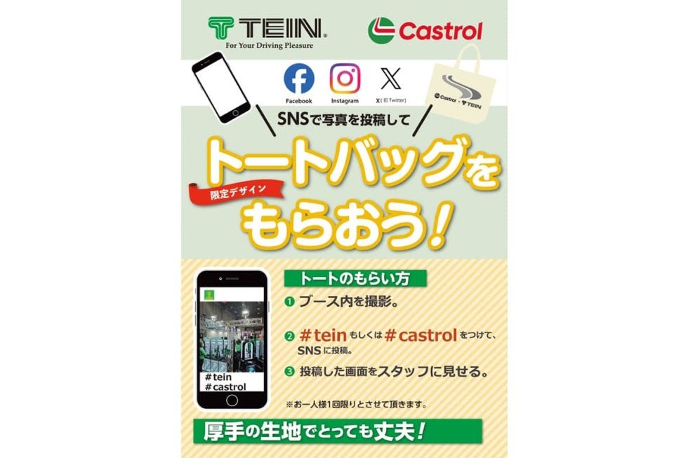 お客様個人のSNS(Facebook、X(旧Twitter)、Instagram)にてテインブース内を撮影・投稿すると、もれなく厚手布製の大型トートバッグがもらえるプレゼント企画を実施します。2026年はTEIN & CASTROLコラボ新デザイン!
