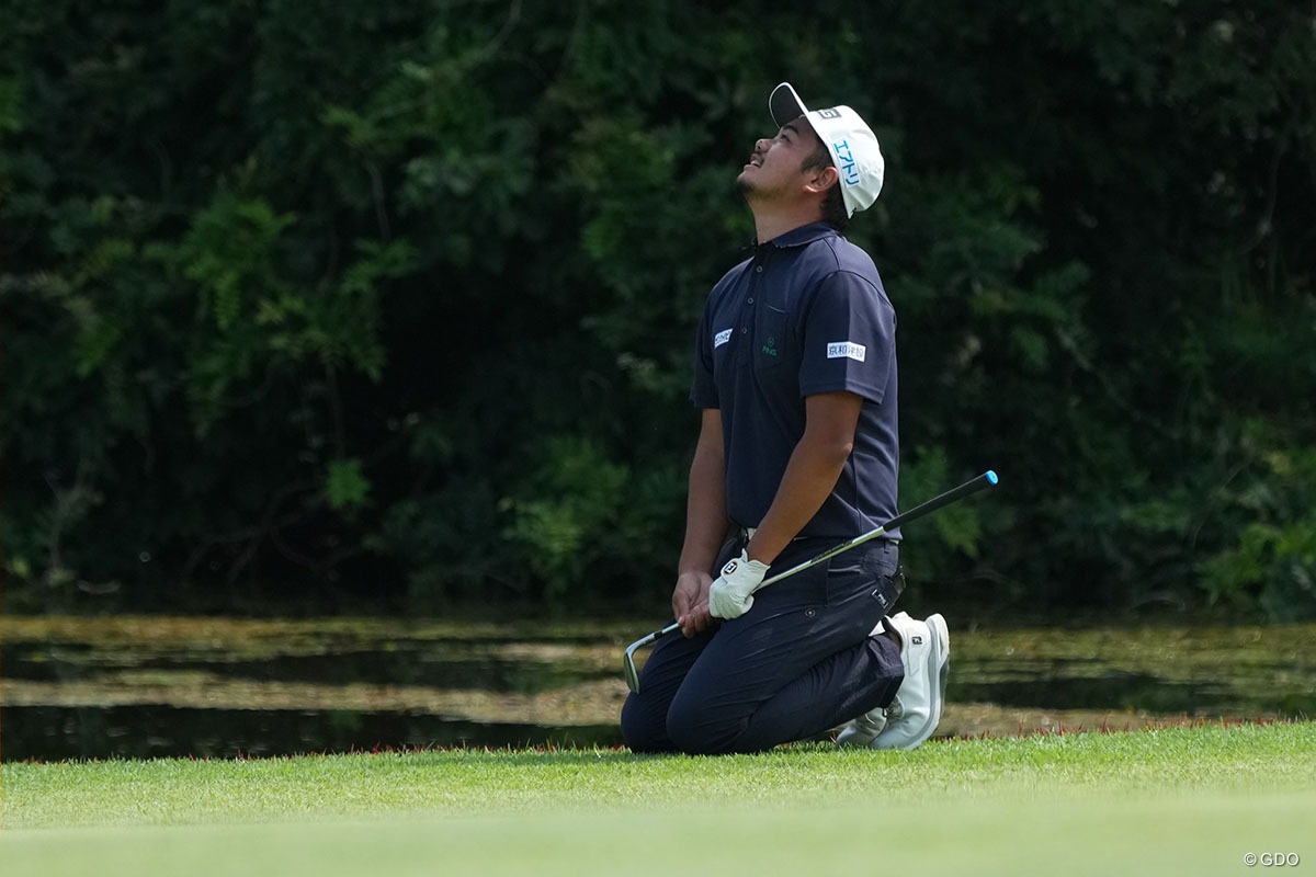 決めれば単独首位でのホールアウト。池に面した薄いラフからのアプローチは、カップの左をわずかに逸れる。待望のツアー初勝利をつかみ損ねた大岩龍一は8番アイアンを手に天を仰いだ。