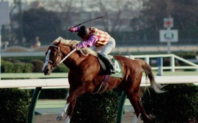 漫画「北斗の拳」に登場する金髪のキャラ・ファルコより名付けられたトウショウファルコ。尾花栗毛のイケメンとあって下級条件時から注目を集めていたが、遂に実力が人気に追い付いた瞬間でもあった。続くAJCCも制したが、その後は脚元の不安に悩まされ、天皇賞(秋)の15着の一戦のみで引退。それでも東京競馬場の誘導馬に転身すると、第二の馬生でも絶大な人気を集めたのだった。
