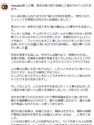 「(少し前の話にはなりますが)戸籍上の性別を変更し、男性となり、とっっっても素敵な女性の方と結婚致しました!実はサッカー選手を引退できた1番の理由はこの夢を叶える為でした」
