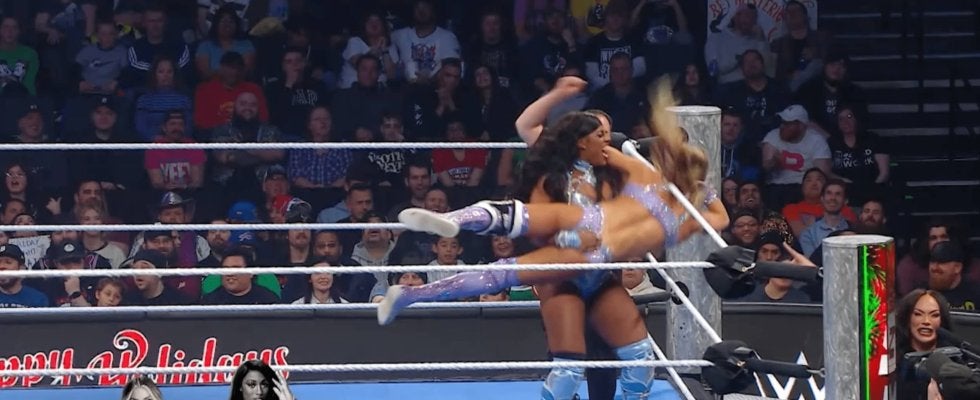 注目の一戦は、日本時間12月27日に開催された「SMACK DOWN」に行われたラッシュ・レジェンドとシャーロット・フレアのシングルマッチ。両者のフィジカルがぶつかり合う激しい展開の中、ひときわ異彩を放ったのが試合中盤のワンシーンだった。
