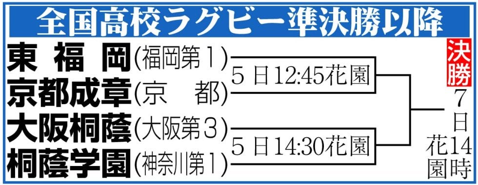 全国高校ラグビー大会(大阪・花園ラグビー場)の5日に開催される準決勝のカードが決まった。