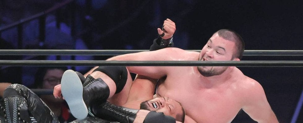 しかし、悪の攻撃は止まらない。EVILが放った白い粉を顔面に浴びると、スコーピオンデスロックで捕獲。ドームに「ウルフコール」がわき起こりロープへ逃げると大歓声。ラリアット連発を耐え反撃しパワースラムで大逆転。オリンピックスラムでたたき込み、ボディスラムから「行くぞ!」と雄たけびをあげ、トップロープから棚橋弘至の必殺技「ハイフライフロー」をさく裂させた。
