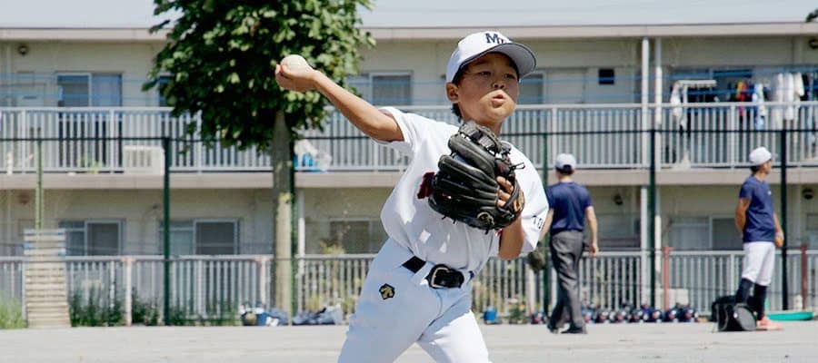 小学生へのスローイング指導で意識するのは「回旋運動(体をひねる動き)を入れながら投げる練習をすること」。体全体をひねるように使って、手投げにならないように注意することで送球の正確性がアップする。