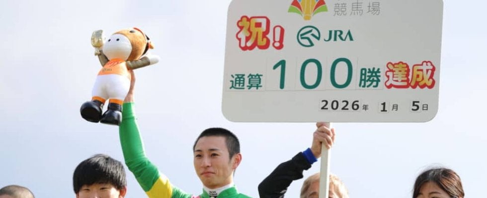 1月5日、京都競馬場で行われた大5Rで、タガノアルトゥーラに騎乗し1着となった吉村誠之助騎手が、JRA通算100勝を達…