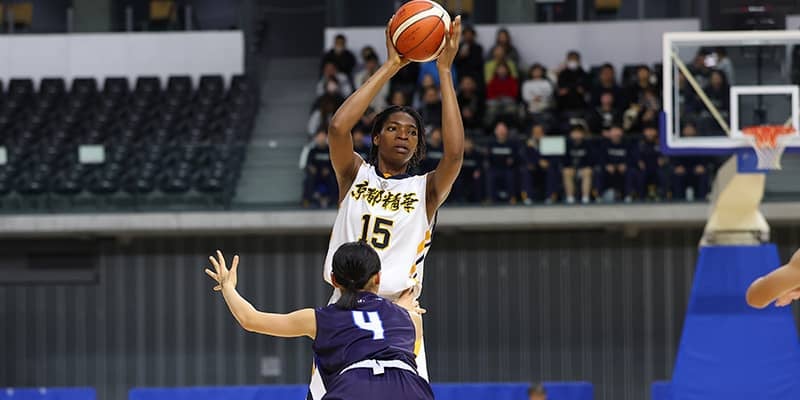 試合開始とともに、京都精華はアニボグジェニファーチナザのペイントアタックを中心に得点をテンポ良く奪い、22-11の2ケタリードで最初のクォーターを終了。第2クォーターでも京都精華の勢いは止まらず、スティールから着実に速攻へつなげていくと、41-16の25点リードでハーフタイムを迎えた。
