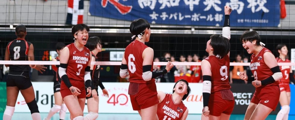 細田学園は、パワーのある1年生攻撃陣の力強いスパイクが炸裂(さくれつ)。要所で松本が得点を決め、粘る高知中央を振り切った。