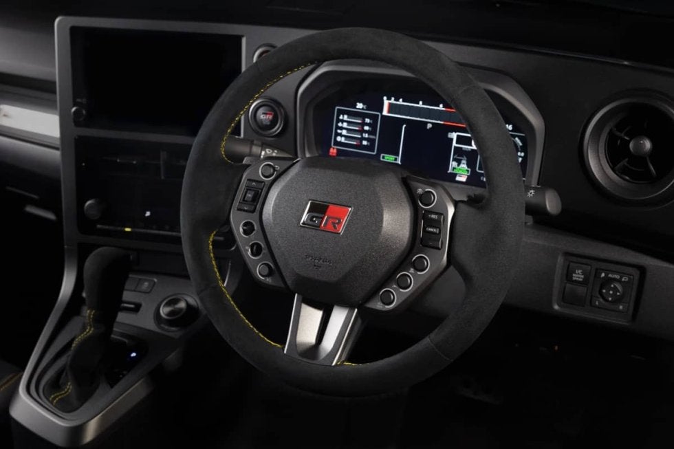 スエード表皮を使ったステアリングホイールも専用装備です。ステアリングホイールはモータースポーツにおける操作性を追求し、外径をひとまわり小径化するとともに、パドルシフトやステアリングスイッチの形状を変えています。ステアリングスイッチはGRヤリスRally2からの学びを得て、各種スイッチが独立した形状としました。