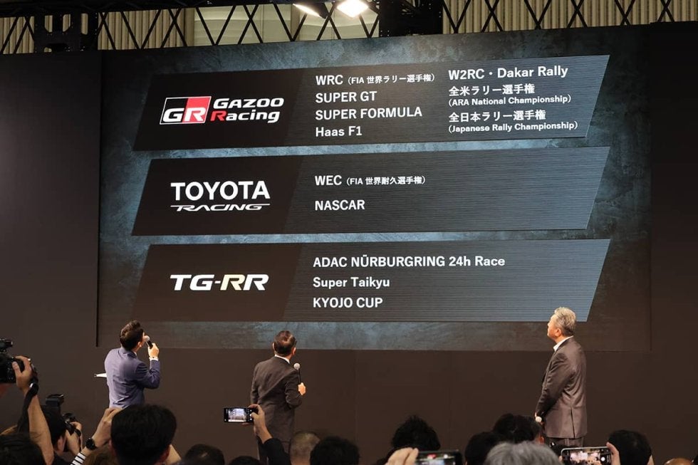 TGRは先日、名称をGRに変更することを発表したばかりだが、ジャイアーノは壇上で「トヨタ・レーシング」を立ち上げることを発表。GRとの棲み分けとして、GRは世界ラリー選手権(WRC)、SUPER GT、スーパーフォーミュラ、Haas F1、世界ラリーレイド選手権(W2RC)/ダカールラリー、全米ラリー選手権(ARA)、全日本ラリー選手権(JRC)、トヨタ・レーシング(TR)は世界耐久選手権(WEC)、NASCAR、TG-RRはニュルブルクリンク、スーパー耐久、KYOJO CUPを展開する。