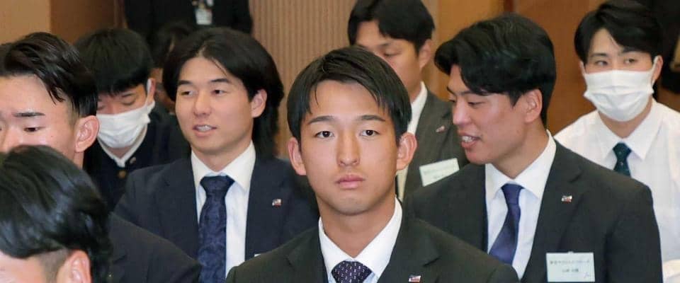 ヤクルトのドラフト1位・松下歩叶内野手(22)=法大=が9日、「NPB新人研修会」に参加後、阪神のドラフト1位・立石(…
