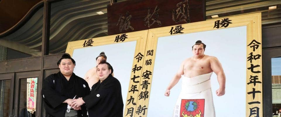 安青錦は初めての優勝額を前に「思ったよりカッコイイ。あした(の優勝額除幕式)も楽しみ。思ったより大きかった」と喜びを口にした。縦3・17メートル、横2・265メートル、重さ約60キロ。米国人芸術家キース・ヘリング作品が描かれた化粧まわし姿を「師匠と一緒に決めました」と選択した。