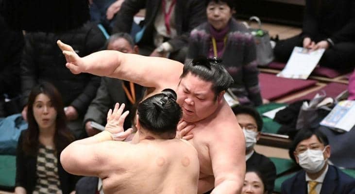 9日に現役客室乗務員の祐華さんとの婚約を発表し、注目を集めた剣翔。若ノ勝に突き放され、回り込みながら突き落としを狙うも体を正面に置かれ続け突き出された。