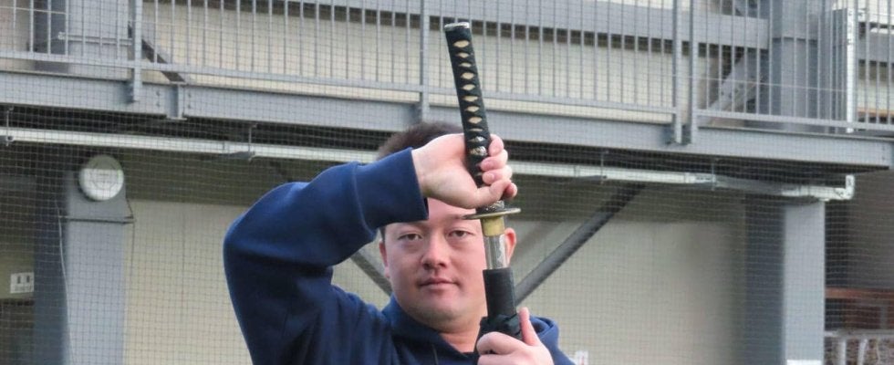 そんきょの姿勢から、刀をさやから抜いて、勢いよく振る。まさに、侍-。牧は「どこを、どう使うかを意識すればすごく面白い」。単純な動作に見えるかもしれないが、1つ1つの動きを再現するのが難しい。おととしの木刀よりもさらに細く、重い。通算打率2割9分5厘を誇る牧でも、刀の扱いは「まだです」と苦笑い。それでも「体幹とあとは手の動きと、上半身の右側と左側の使い方の動きが大事になってきます」と、コツはつかみかけている。