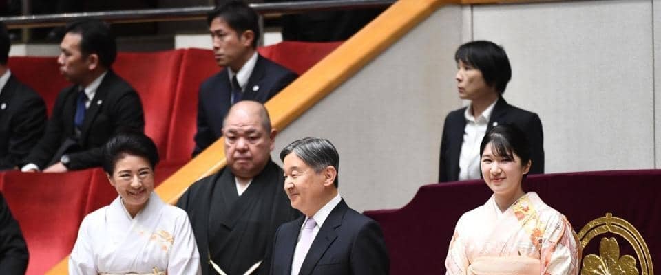 天皇陛下が観戦される「天覧相撲」が行われ、天皇、皇后両陛下と長女愛子さまが国技館2階の貴賓席にお座りになった。皇后雅子さまは薄紫色の着物姿、愛子さまは華やかなピンクの振袖姿で来館された。