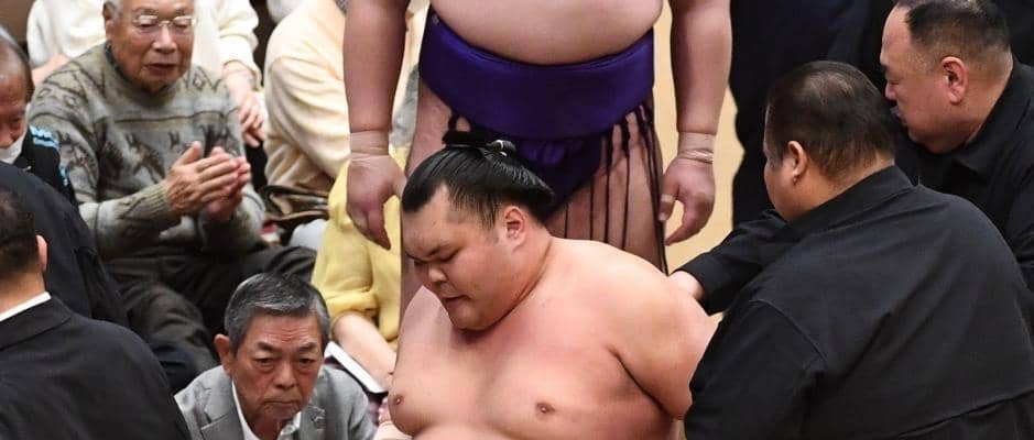 すぐさま力士用の車椅子が搬入され、右膝を押さえていた栃大海。最後は親方3人に抱えられ、車椅子に乗せられた。花道を引き揚げる際にはファンから激励の拍手を送られていた。