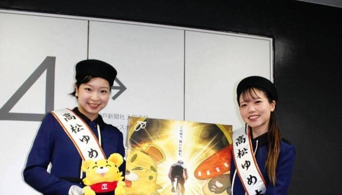 改修工事に伴い、小松島競輪場で29日から2月1日まで開催される高松競輪開設75周年記念「G3・玉藻杯争覇戦in小松島」のPRのため、高松競輪場の志度公一場長ら関係者が19日、高松ゆめ大使の長谷川舞由さんと大浦鈴花さんを伴って、大阪市のデイリースポーツを訪れた。