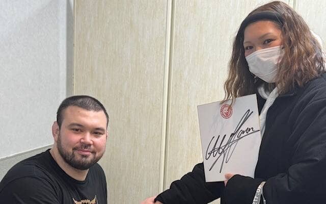大会前に1・4東京ドームでのデビュー戦でEVILを破りNEVER無差別級王座を奪取したウルフアロンが初のサイン会を行った。