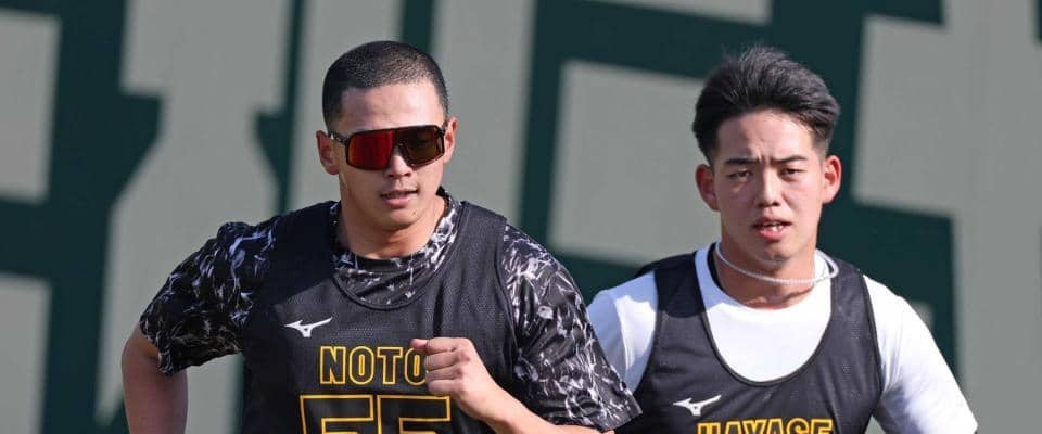 阪神のドラフト5位・能登嵩都投手(24)=オイシックス=が19日、兵庫県尼崎市の日鉄鋼板SGLスタジアムで行われた新人…