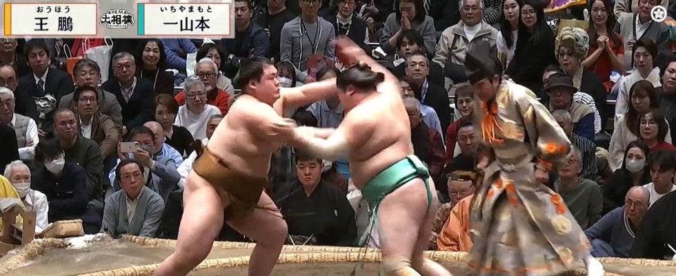 小結・王鵬(大嶽)と前頭筆頭・一山本(放駒)の一番。立ち合いから激しい突き合いの攻防となったが、王鵬が右の突き押しで攻め立て一山本の体が起きたところを、鮮やかにはたき込んだ。一山本の188センチ、157キロの巨体はたまらず前のめりに崩れ、土俵下に転がり落ちた。王鵬は4勝目(5敗)を挙げたが、敗れた一山本は1勝8敗となり、九日目にして早くも負け越しが決まった。