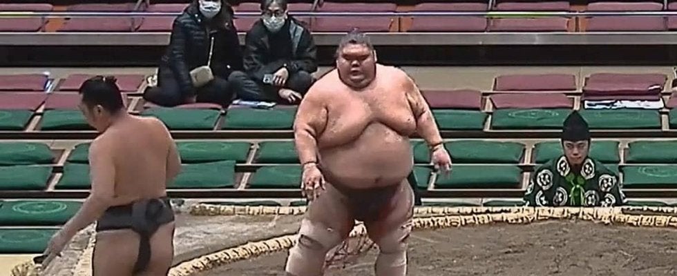 三段目七十枚目・佐田ノ国(境川)と三段目六十枚目・旭将里(大島)の一番。立ち合い手を出して当たったのはベテラン37歳の佐田ノ国。だが体重185.4キロの巨漢・旭将里が前に出ると、佐田ノ国は圧力に負けて後退した。そして土俵際、佐田ノ国はまだ俵に足がかかって残っている状態だったものの、突如、後ずさるように土俵の外へ。自ら土俵を割ってしまうという予想外の事態に、勝った旭将里は咄嗟に右手を佐田ノ国に差し出したが、そのまま土俵を割った佐田ノ国に思わず「え?」と驚いたような表情を浮かべ、二度見していた。