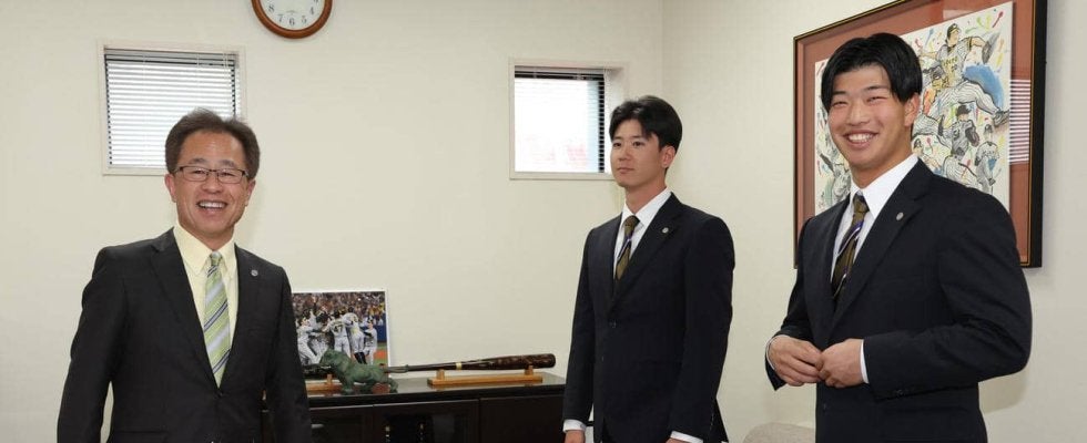 阪神山田脩也内野手(20)が20日、兵庫・西宮市内の球団事務所で行われた「20歳記念品贈呈式」に、百崎蒼生内野手(20)…