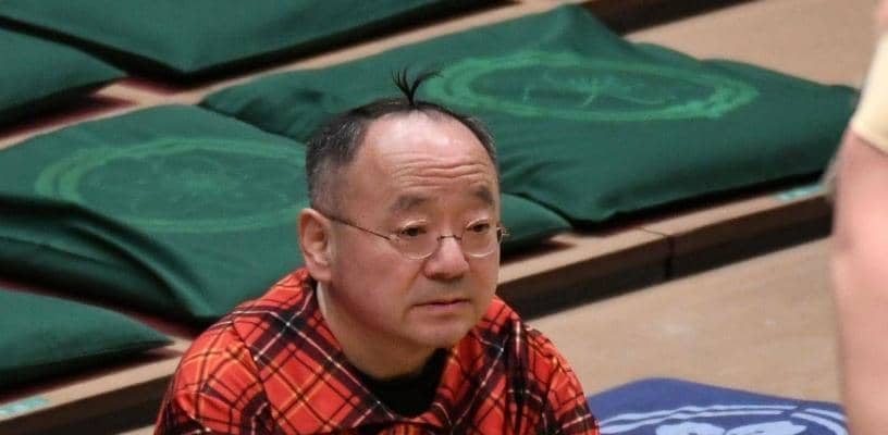 ぴろきは赤と黒の大きなチェック柄のシャツを着て、砂かぶり席に。頭のてっぺんにちょんまげのように髪を結った姿はステージ上と同じで、腕を組んで熱心に土俵上を見つめた。