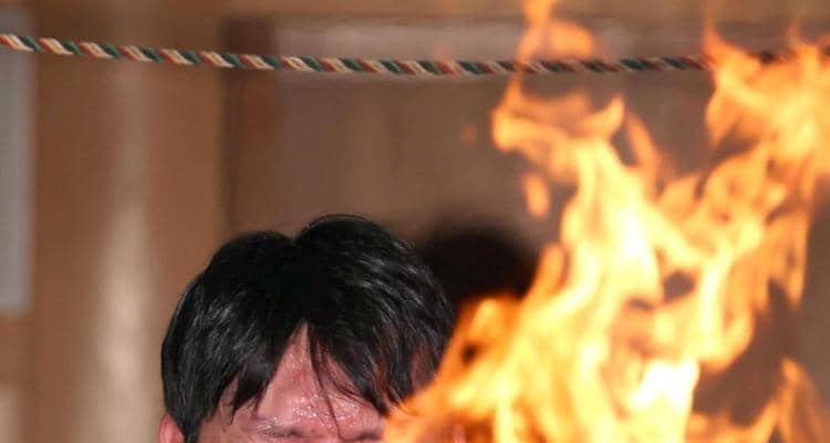 25年1月18日 約2時間、高さ3メートルまでに達した火柱の前で「広島優勝 心願成就」と絶叫しながら祈願。