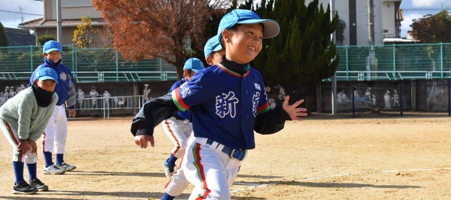 次に、シンプルだが“みんなで楽しめる”練習法だ。全国制覇の実績を持つ大阪の学童チーム・新家スターズのジュニアチームで行っているのは、グラウンドに描いた直径4メートルほどの円をリレー形式で走るメニュー。転んでも良いくらいに体を内側に傾けて走ることで、コーナリング技術や基礎体力が自然と身につき、冬場の練習ではウオーミングアップとしても効果的だという。低学年のうちから楽しく“走る意識”を植えつけ、学年が上がるにつれて走塁技術や考え方を教えることで、ライバルチームに差をつけることができる。