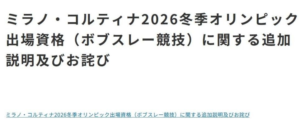 日本ボブスレー・リュージュ・スケルトン連盟は22日、ボブスレー競技の男子2人乗り種目が、出場資格を巡る解釈の誤りで26年ミラノ・コルティナ五輪(オリンピック)に出場できなくなった件について「追加説明」および「おわび」の文書を発表した。
