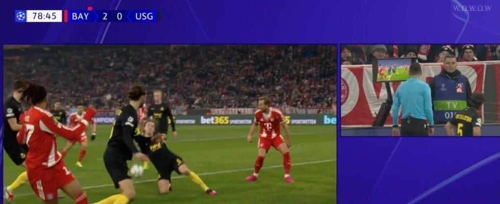 右サイドでボールを持ったミカエル・オリーズが縦に仕掛けて強引にボックス内へと進入すると、右足で中央のケインに折り返す。その前にユニオン・サンジロワーズの選手が身体にボールを当ててピンチを防いだかと思われた。しかし、直後にバイエルンの選手とホームサポーターがジェスチャーやブーイングで一斉に抗議。試合はそのまま続いたが、およそ40秒後にプレーが中断した際にVAR(ビデオ・アシスタント・レフェリー)が介入して該当箇所の確認が行われた。