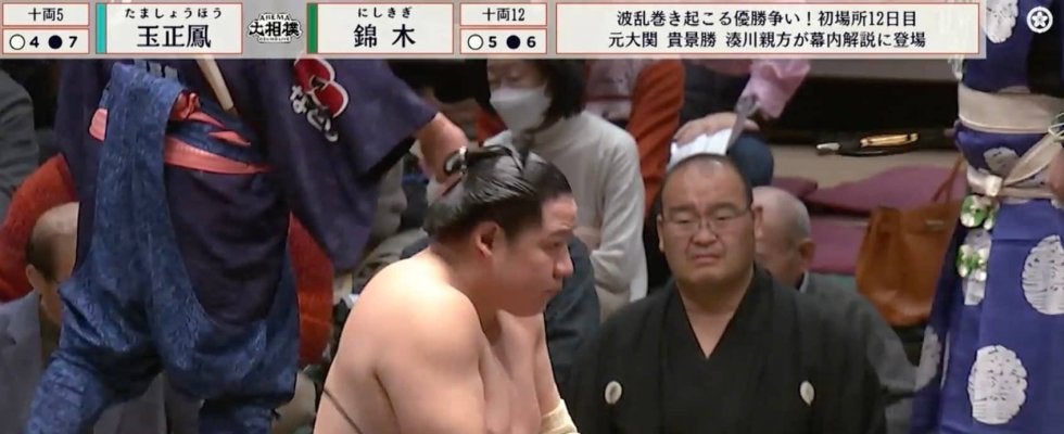 十両五枚目・玉正鳳(片男波)と十両十二枚目・錦木(伊勢ノ海)の取組。向正面の溜まり席には赤いニットの上着を着用した人気お笑いタレントの姿がABEMAの中継で確認できた。