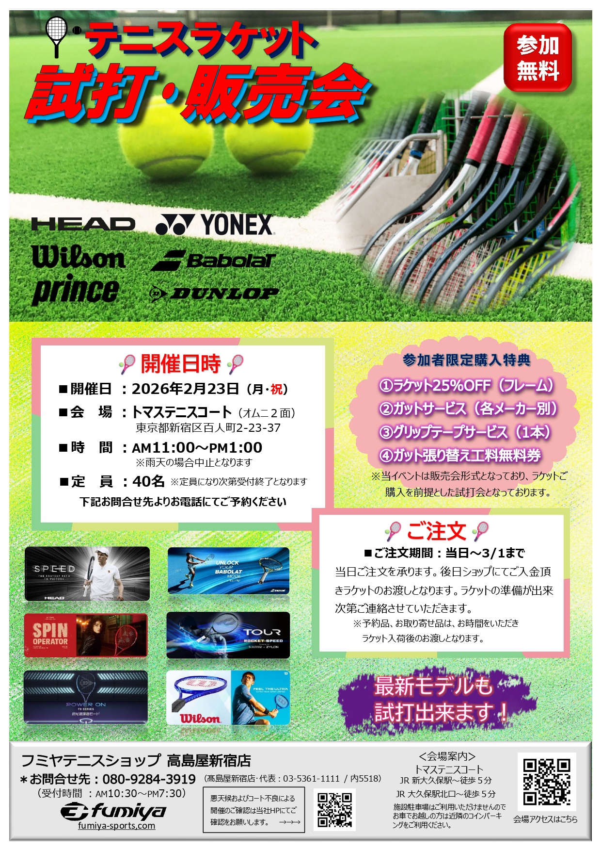 東京都内を中心に複数のテニススクールとテニスショップを運営する株式会社フミヤスポーツは2月23日(月・祝)に、トマステニスコート(東京都新宿区/砂入り人工芝)で参加費無料の最新テニスラケット試打・販売会を開催する。