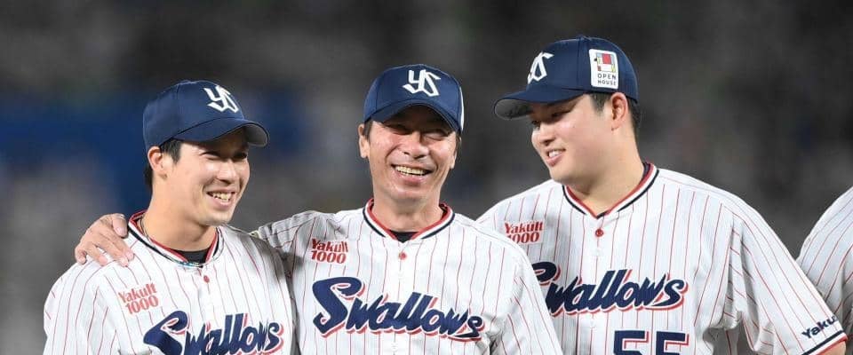 3人の関係がにじんでくるようなショット。高津氏は昨季限りで監督を退任し、村上はメジャー挑戦。山田は復活を目指すシーズンに挑む。