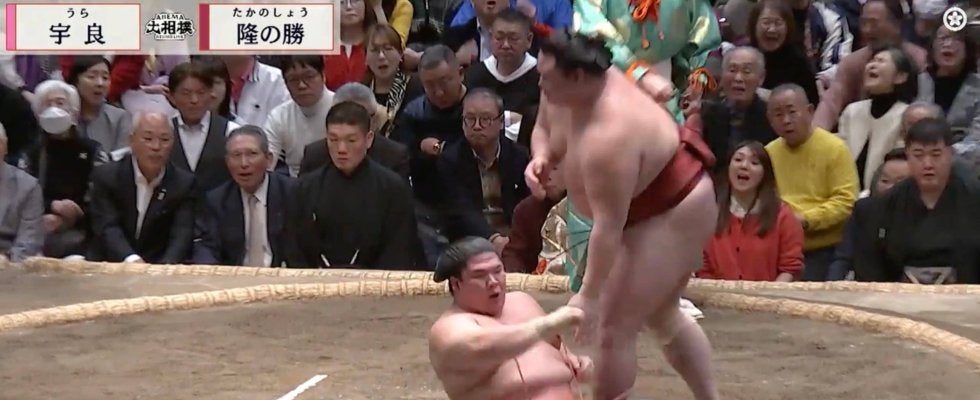 今場所はここまで2勝9敗と大きく負け越している宇良。立ち合いでは頭を下げて低く当たっていったが、隆の勝に力強く突き起こされる苦しい展開。そのままタイミングよく頭を叩き込まれると、宇良はつんのめる勢いのまま前方へ宙を舞った。起き上がった宇良は、自身でも状況に驚いたような表情を浮かべ、館内はどよめき騒然となった。