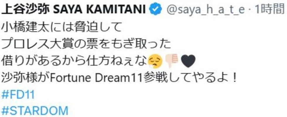 上谷はXに「小橋建太には脅迫してプロレス大賞の票をもぎ取った借りがあるから仕方ねぇな 沙弥様がFortune Dream11参戦してやるよ!」と記した。