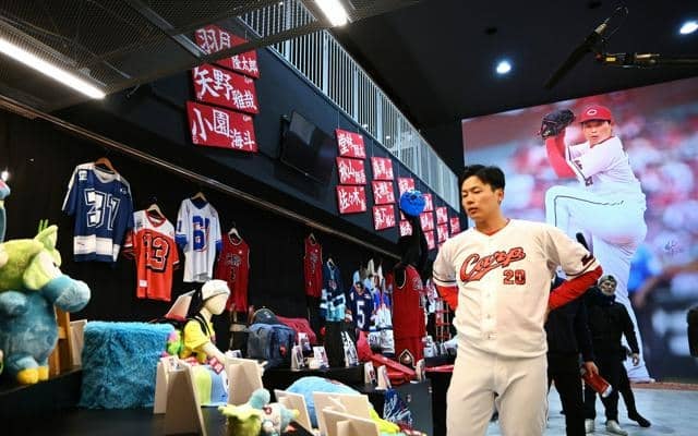 グッズショップの壁画になった自身の写真にサインをするために訪れた栗林良吏投手は、未使用のユニホームのズボンをリメイクしたバッグ(数量限定、1万5千円)を手に、「上着はいろんなグッズがあるけれど、ズボンは斬新」。壁画に選ばれたことについては、「しっかり練習をして、結果で返せるようにしたい」と語った。(上山浩也)