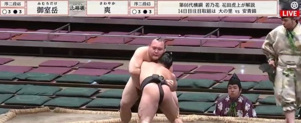 両力士が揃って落下すると、審判を務めていた時津風親方(土佐豊)に激突してしまった。その瞬間、御室岳、爽、そして時津風親方と3人が同時に倒れているという光景に…館内は騒然となり、視聴者は「派手に行った」「これは痛い!」「大被弾!」などとコメントした。