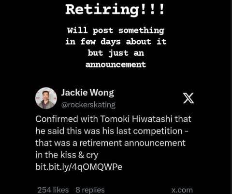 フィギュアスケート男子の19年世界ジュニア王者、米国代表として活躍した樋渡知樹(26)が25日、現役引退を表明した。北京で開催されている4大陸選手権に出場し、最終日のフリーで159・66点、合計240・54点の7位だった。演技後、インスタグラムを更新。「retiring!!!」「引退します~」と日米のファンに向けて報告した。