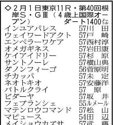 第40回根岸ステークス・G3(1着馬にフェブラリーSへの優先出走権)は2月1日、東京競馬場のダート1400メートルで行…