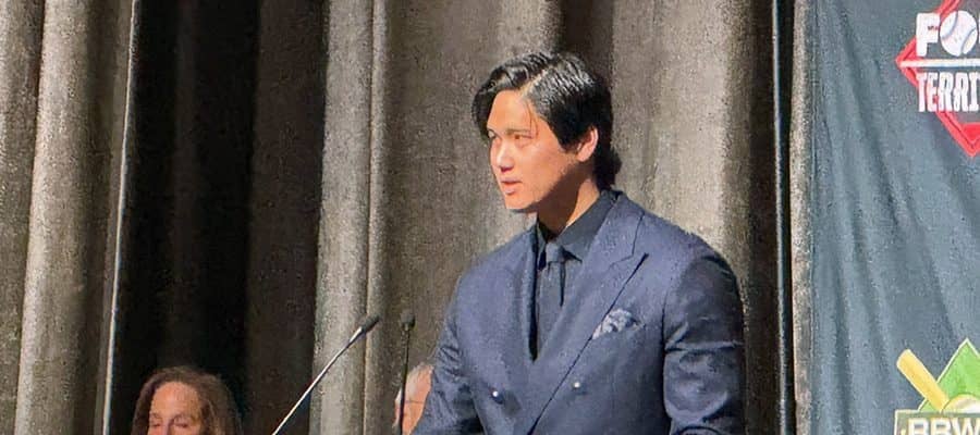 大谷はこの日、壇上で英語でスピーチ。ドジャース球団、BBWAA、代理人のネズ・バレロ氏、そして真美子夫人を「愛する妻」と表現し、家族へ感謝した。