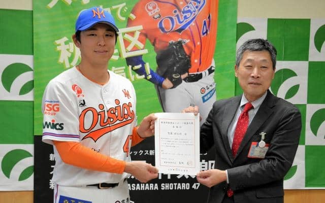 プロ野球の2軍リーグに参加しているオイシックス新潟の笠原祥太郎選手(30)が、新潟市秋葉区スポーツ親善大使に就任した。同区出身の笠原選手は「子どもたちや区民の方々がスポーツの魅力を感じられるよう頑張りたい」と意気込んでいる。