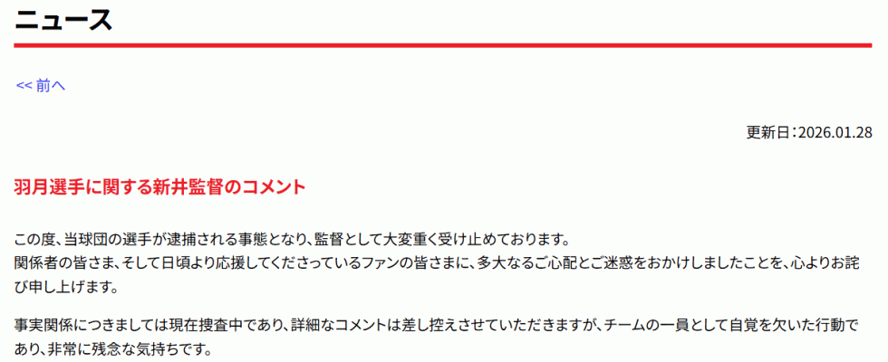 事実関係につきましては現在捜査中であり、詳細なコメントは差し控えさせていただきますが、チームの一員として自覚を欠いた行動であり、非常に残念な気持ちです。